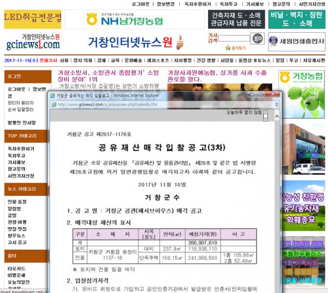 거창군 소유 공유재산을 「공유재산 및 물품관리법」 제29조 및 같은 법 시행령 제26조규정에 의거 일반경쟁입찰로 매각하고자 아래와 같이 공고합니다.
