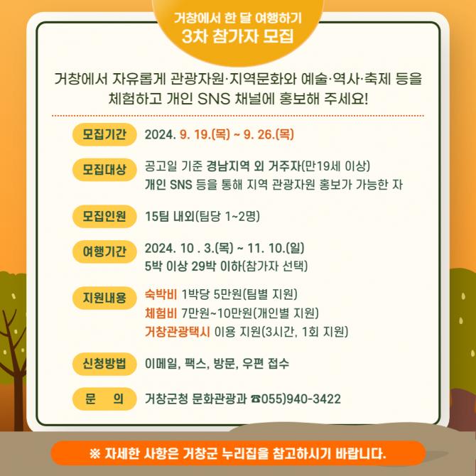 ‘거창에서 한 달 여행하기’ 프로그램 참가자들에게는 5박 이상 29박 이내로 팀당 하루 5만 원 이내의 숙박비와 1인당 7만 원에서 10만 원 이하의 지역 문화·예술·역사·축제 체험비가 지원된다.