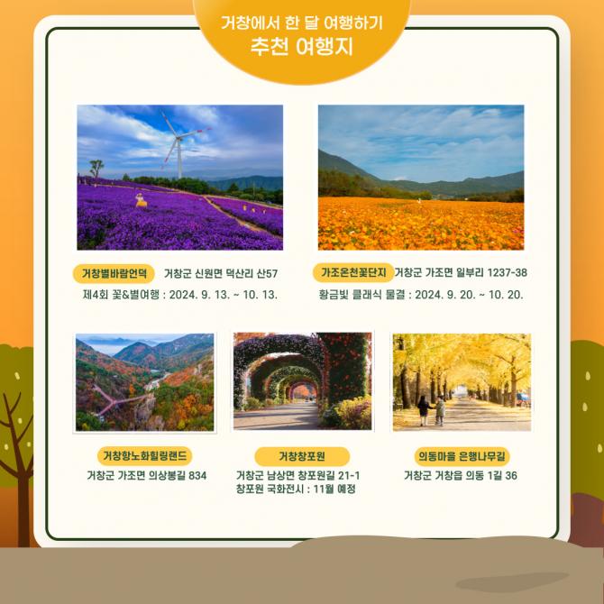 거창군은 참가자들에게 10월에서 11월에 방문하기 좋은 관광지로 아스타 국화가 만발한 거창별바람언덕, 단풍으로 물든 거창항노화힐링랜드와 수승대 관광지, 가을꽃이 가득한 거창창포원, 황화 코스모스가 일렁이는 가조온천꽃단지, 의동마을 은행나무길 등을 추천할 계획이다.