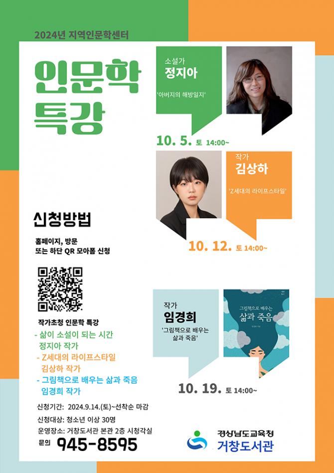 거창도서관은 이어서 ▲ 10월 12일(토) 채널A 10대를 위한 콘텐츠 제작 담당 Z세대 팀장 김상하 작가에게 듣는「Z세대 라이프 스타일」 ▲ 10월 19일(토) 그림책을 통해 삶을 통찰하고 죽음을 이해하며 웰다잉을 이야기하는 임경희 작가의 「그림책으로 배우는 삶과 죽음」 ▲ 11월 9일(토) 제주의 문화와 정서를 이해할 수 있는 송일만 작가의「저들바당과 제주 이야기」를 운영할 예정이다.