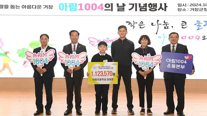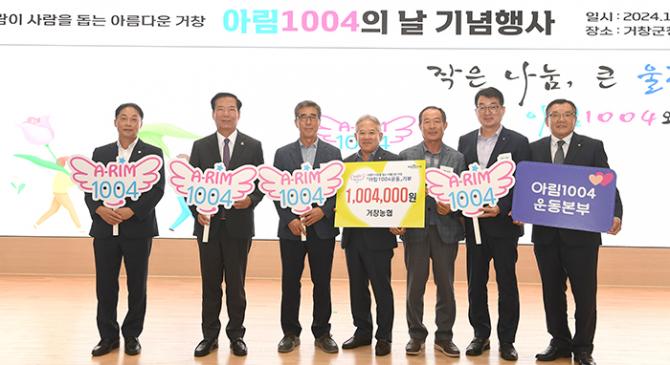 거창농협(조합장 신중갑), 거창군여성단체협의회(회장 김미숙), 아림1004운영위원회 부본부장인 정순우(한들주유소 대표), 주상면새마을협의회(회장 박성주), 주상면상도평마을회(이장 신칠식) 등 6개 기관·단체에서 각 100만 4,000원을 아림1004운동본부에 기탁했다.
