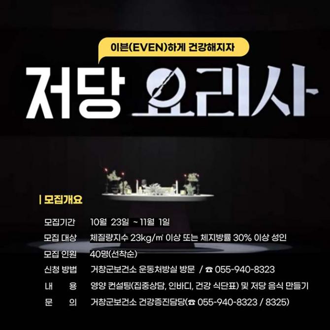거창군은 10월 23일~11월 1일까지 8일간 비만예방관리사업 프로그램 ‘저당요리사’ 참여자 40명을 선착순 모집한다고 밝혔다.