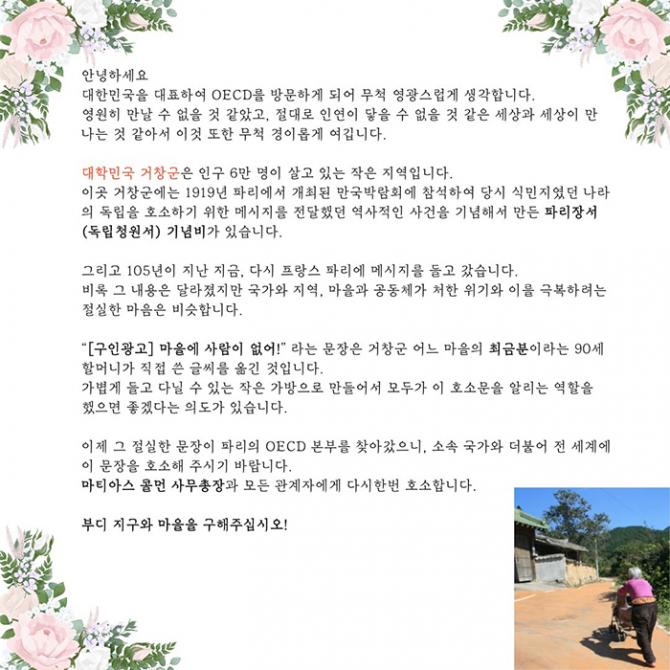 11월 12일 프랑스 파리 경제협력개발기구(OECD) 본부에서 거창군의 90세 최금분 할머니가 쓴 호소문 ‘(구인광고)-마을에 사람이 없어!’라는 문구가 새겨진 에코백이 거창군청 관계자를 통해 OECD 관계자에게 전달됐다.