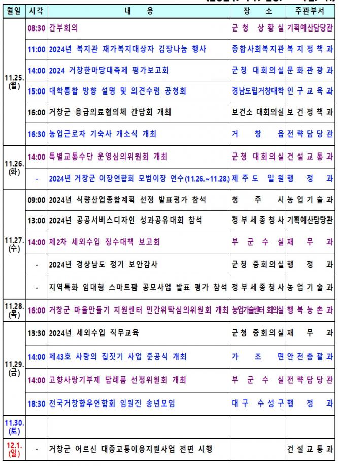 거창군이 매일 어떤 행정을 펴나가는지 궁금하십니까? 거창인터넷뉴스원은 거창군의 업무일정을 군민들에게 알림으로써 군정에 관심있는 군민들의 궁금증을 해소하고, 군민과 함께 하는 정보공유의 장으로 만들어 나가겠습니다. ![]()