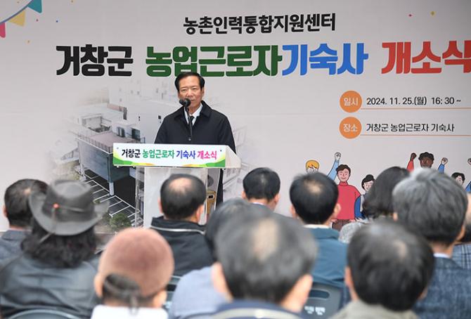 거창군은 11월 25일 구인모 거창군수, 이재운 거창군의회 의장, 김일수·박주언 도의원, 군의원, 농축협조합장, 이장연합회장을 비롯한 지역 내 기관단체장과 주민 등 100여 명이 참석한 가운데 거창군 농업근로자 기숙사(거창읍 대평3길 36. 거창자동차번호판 앞) 개소식을 개최했다.
