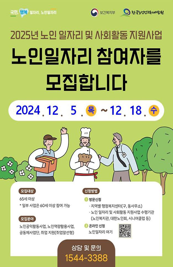 노인 일자리 참여 신청 기간은 12월 5일~12월 18일까지 2주간이다.