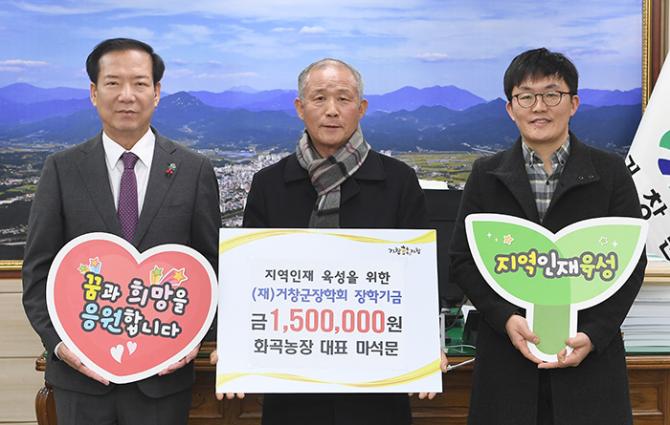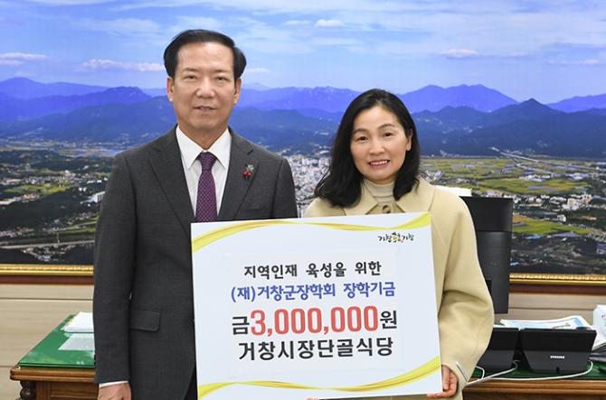(재)거창군장학회(이사장 구인모 거창군수)는 12월 17일 거창시장 단골식당(대표 서보민)과 거창오리영농회(회장 서인성), 화곡농장(대표 마석문)이 군수실을 방문해 장학금을 기탁 했다고 밝혔다.