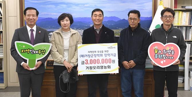 도내 오리 사육 규모 1위를 차지하고 있는 거창오리영농회는 지난 2018년, 2020년, 2022년, 2023년 각각 장학금 300만 원을 꾸준히 기탁해 오고 있다.