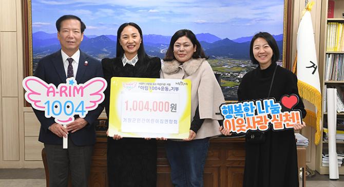 거창군은 12월 23일 거창군 민간어린이집연합회(회장 김화숙), 대한노인회 거창군지회(지회장 신종학)에서 아림1004운동 후원금 각각 100만 4,000원을 기탁했다고 밝혔다.