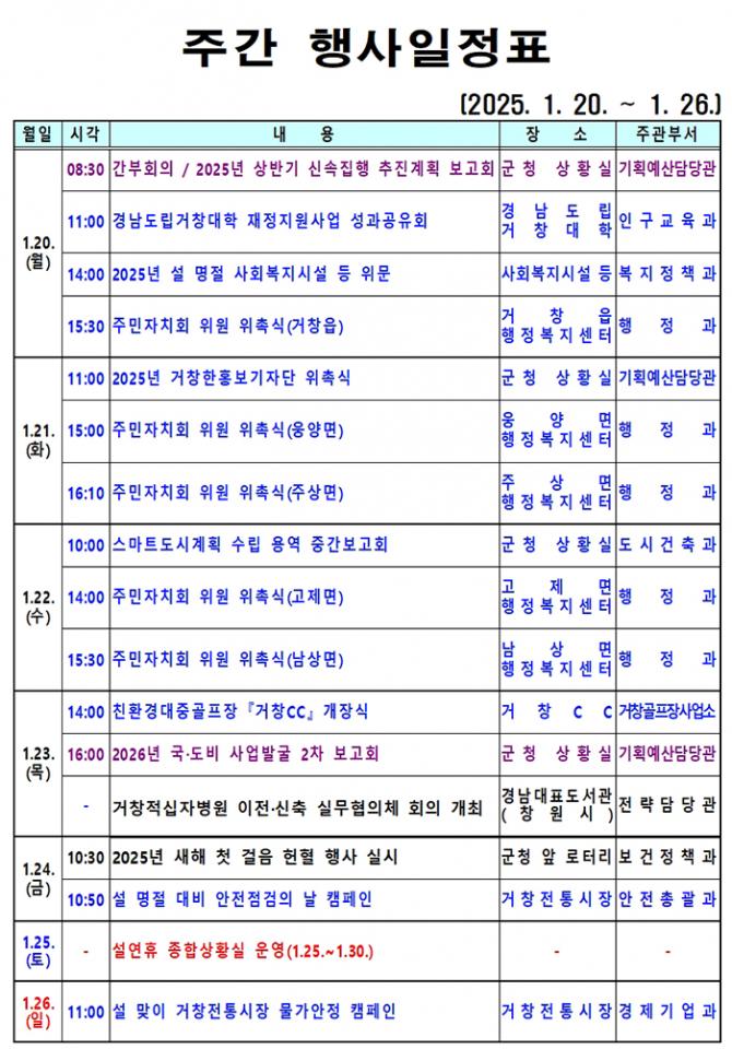 거창인터넷뉴스원은 거창군의 업무일정을 군민들에게 알림으로써 군정에 관심있는 군민들의 궁금증을 해소하고, 군민과 함께 하는 정보공유의 장으로 만들어 나가겠습니다.