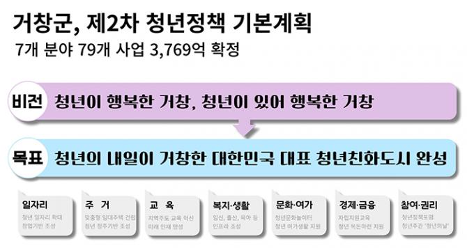 제2차 청년정책 기본계획의 비전은 ’청년이 행복한 거창, 청년이 있어 행복한 거창‘으로 설정됐으며, ’청년의 내일이 거창한 대한민국 대표 청년친화도시 완성‘을 목표로 하고 있다.