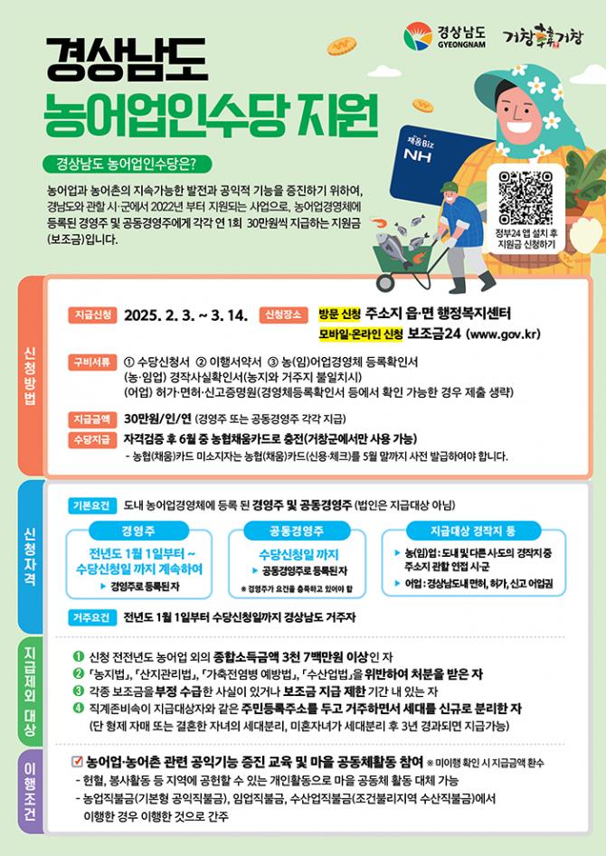 지원 자격은 경영주의 경우 2024년 1월 1일부터 수당 신청일까지 경상남도에 주소를 두고, 같은 기간 농어업경영체에 경영주로 등록되어 있어야 한다.