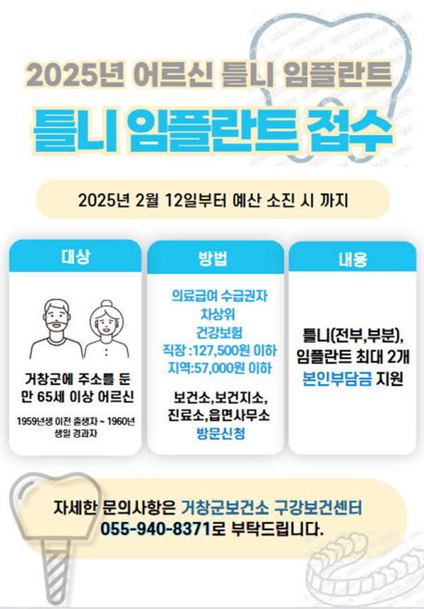거창군은 치아의 결손으로 음식물 섭취가 어려운 어르신들과 중증장애인을 대상으로 ‘틀니 임플란트 지원사업’ 신청 접수를 시작한다고 밝혔다.