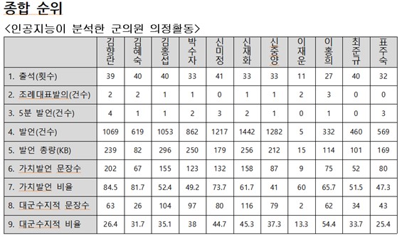 이번 평가는 함께하는 거창이 거창군의회 최근 회의록 제280회부터 제283회까지의 데이터를 기반으로 인공지능을 활용하여 군의원 개인 평가와 군의원 비교 평가로 나누어 진행됐다.