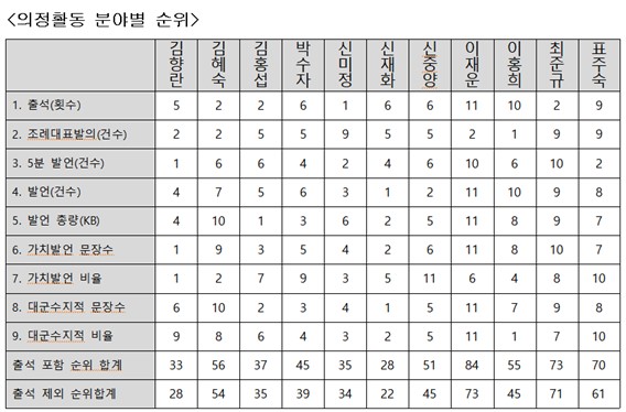 군의원 비교 평가는 9개 분야별로 군의원의 의정활동을 분석하는 방식으로 진행되었다.