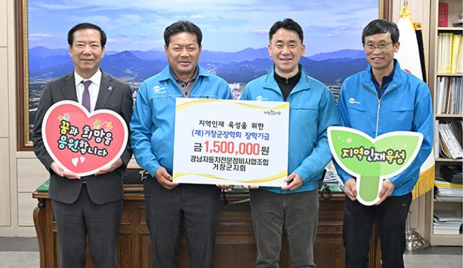 (재)거창군장학회는 3월 13일 지역인재 육성을 위해 거창풍력발전(주)에서 500만 원, 신연숙 나무새 대표가 100만 원, 경남자동차전문정비사업조합 거창군지회에서 150만 원을 기탁했다고 밝혔다.