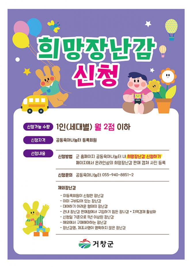 거창군 공동육아나눔터 등록회원이면 누구나 신청할 수 있으며, 군 홈페이지 공동육아나눔터란의 ‘희망장난감 신청’ 게시판을 통해 간편하게 신청하면 된다. 선정된 장난감은 일정 기간 내 구비 후 대여가 가능하며, 반납 후 다른 어린이들도 함께 이용할 수 있도록 운영된다.