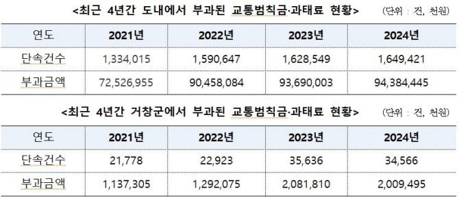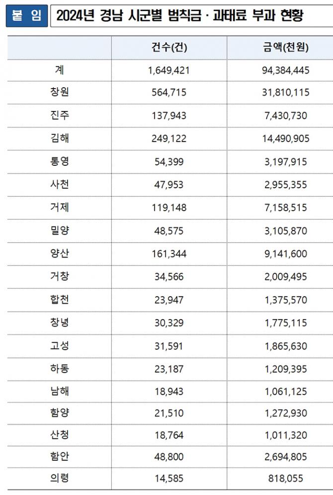 이는 3년 전인 2021년(725억 5,200여 만원)보다 30% 증가한 금액으로, 도내에서 가장 많은 과태료과 부과된 창원시의 경우, '24년 과태료 및 범칙금은 316억 원이었다.