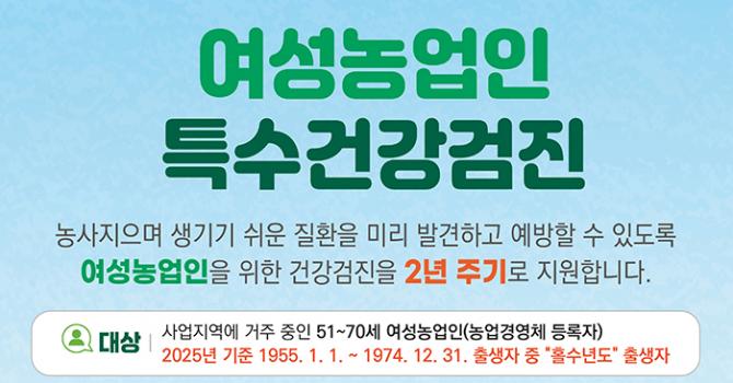 올해 검진 대상은 거창군에 거주하는 51세부터 70세(1955년 1월 1일 ~ 1974년 12월 31일) 여성농업인 중 홀수 연도 출생자로, 농업경영체에 등록된 경우 신청할 수 있다.