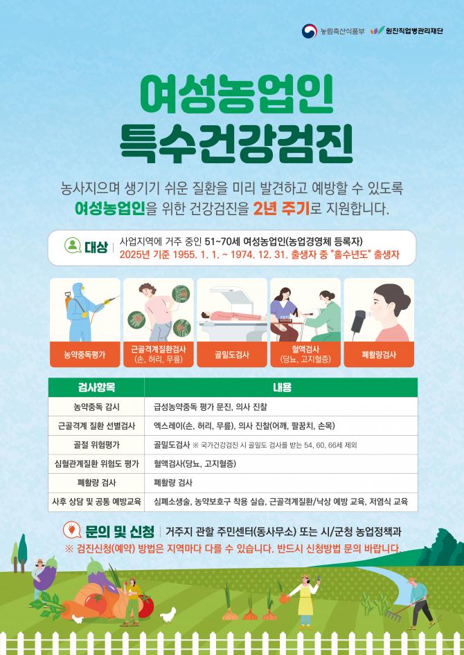 최남미 농업축산과장은 “이번 검진을 통해 여성농업인의 건강을 증진하고, 농작업으로 인한 질환을 예방하는 데 최선을 다하겠다”라고 말했다.
