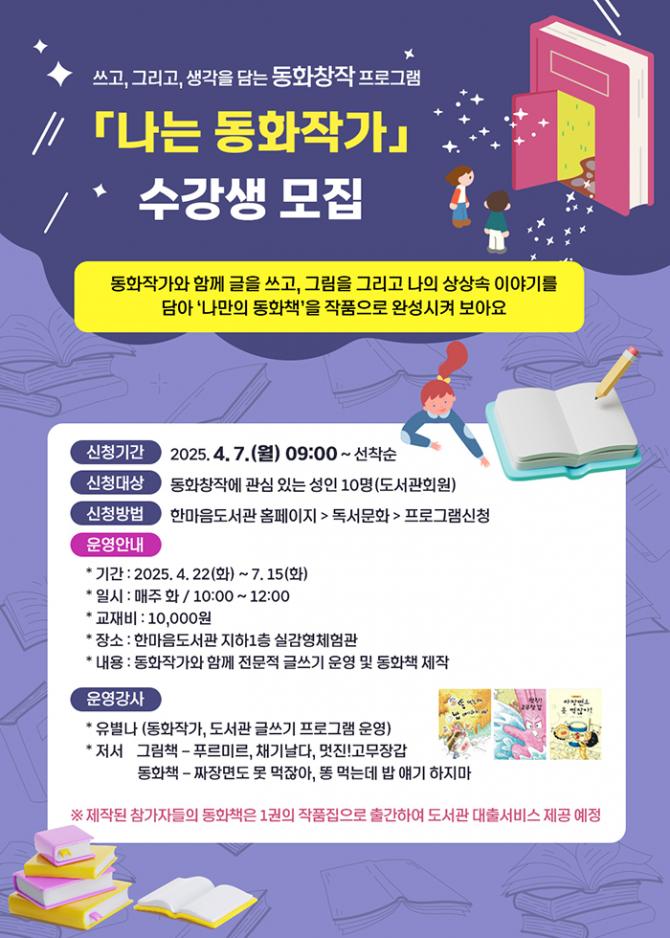 ‘나는 동화작가’ 프로그램은 4월 22부터 7월 15일까지 매주 화요일 오전 10시에 진행되며, 총 12회에 걸쳐 운영된다.