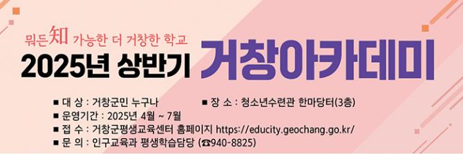 2025년 거창아카데미 상반기 강좌는 거창군민 누구나 참여할 수 있으며, 참가 신청은 거창군 평생교육센터 홈페이지에서 접수할 수 있다.