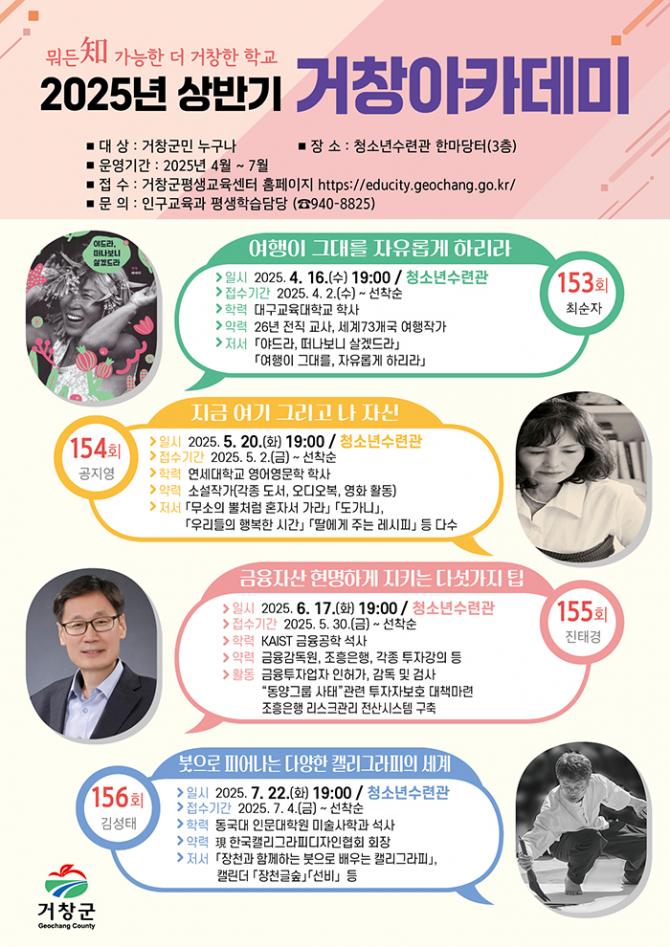2025년 상반기 거창아카데미는 △4월 16일 최순자 여행작가의 ‘여행이 그대를 자유롭게 하리라’ △5월 20일 공지영 소설가의 ‘지금 여기 그리고 나 자신’ △6월 17일 진태경 투자전문가의 ‘금융자산 현명하게 지키는 다섯 가지 팁’ △7월 22일 김성태 캘리그래피 강사의 ‘붓으로 피어나는 다양한 캘리그래피의 세계’로 구성돼 있다.