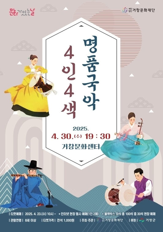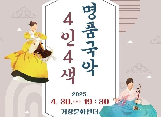 ‘명품국악 4인4색’은 거창을 대표하는 지역 국악인들이 참여해 각자의 개성과 연주 특색이 돋보이는 무대를 선보이며, 남녀노소 누구나 즐길 수 있는 다채로운 국악 장르를 한자리에 만날 수 있는 명품 공연이다.