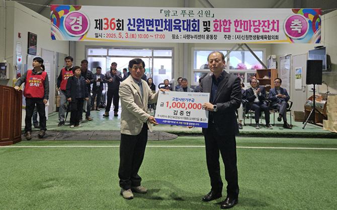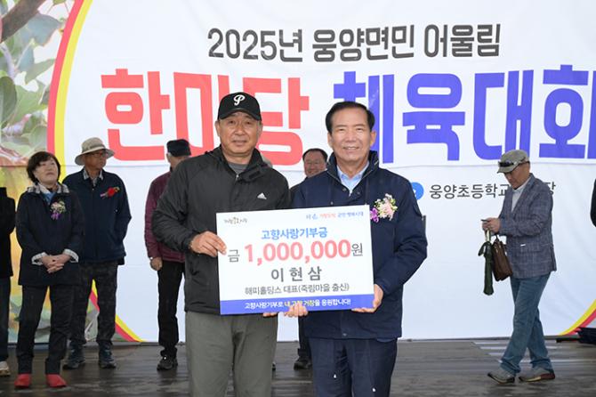 이날 웅양‧신원‧가조‧가북면 면민 체육대회에서 지역 출신 향우들이 고향사랑기부금을 전달하여 면민 화합과 축제의 열기를 더했다.