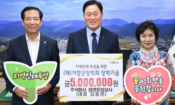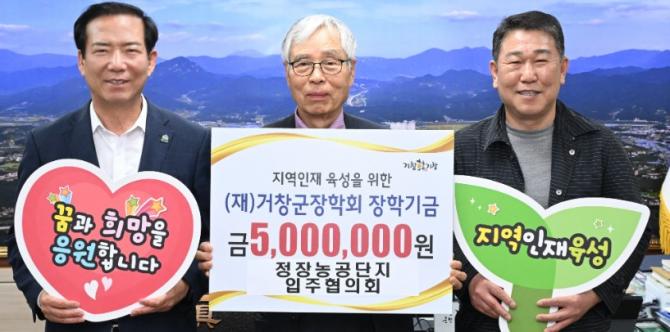 (재)거창군장학회는 5월 13일 지역인재 육성을 위해 정장농공단지입주협의회(회장 이구섭)에서 500만 원, 김중연 주식회사 정연포장상사 대표가 500만 원, 신진호 작사가(아림신문사 대표)가 약 107만 원을 각각 장학금으로 기부했다고 밝혔다.