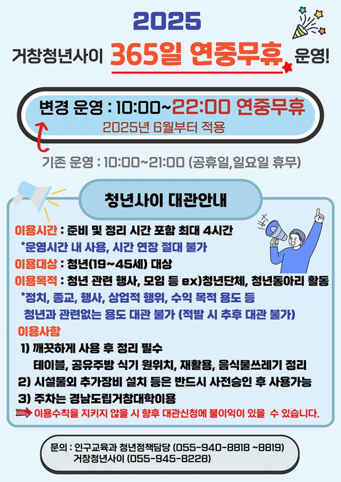 거창청년사이는 청년을 위한 맞춤형 공간으로, 운영 관련 자세한 정보는 거창청년사이 누리집(geochang.go.kr/cccg.web)을 통해 확인할 수 있다.