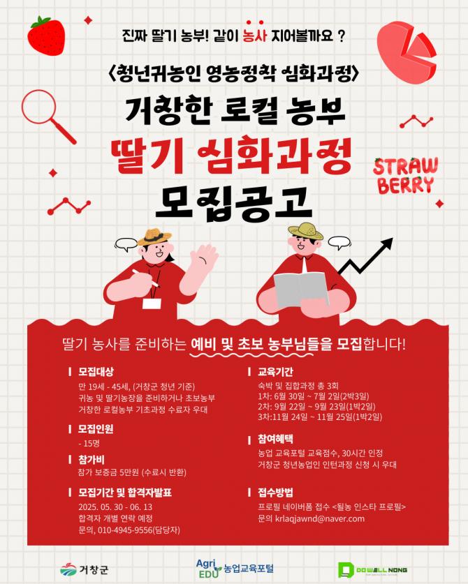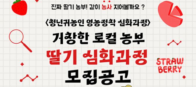 거창군은 청년 귀농인의 안정적 정착을 지원하기 위해 지방소멸대응기금 사업비로 추진하는 청년 귀농인 영농정착 프로그램 딸기 심화과정에 참여할 교육생을 모집한다고 밝혔다.
