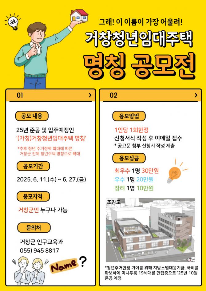 거창군은 올해 10월 준공 예정인 (가칭)거창 맞춤형 청년임대주택의 새 명칭을 6월 27일까지 공모한다.
