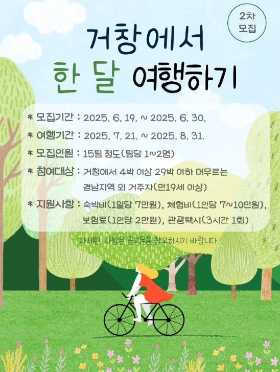 ‘거창에 한 달 여행하기’ 사업에 대한 자세한 내용은 거창군청 홈페이지(geochang.go.kr)에 게시된 공고문을 통해 확인할 수 있다.