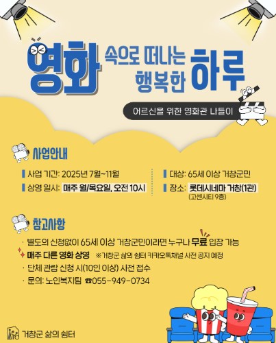 이번 지원사업은 관내 65세 이상 어르신을 대상으로 하며, 어르신들이 선호하는 영화뿐만 아니라 콘서트, 교육 등 다양한 문화 콘텐츠를 제공해 즐겁고 유익한 여가 시간을 지원할 예정이다.
