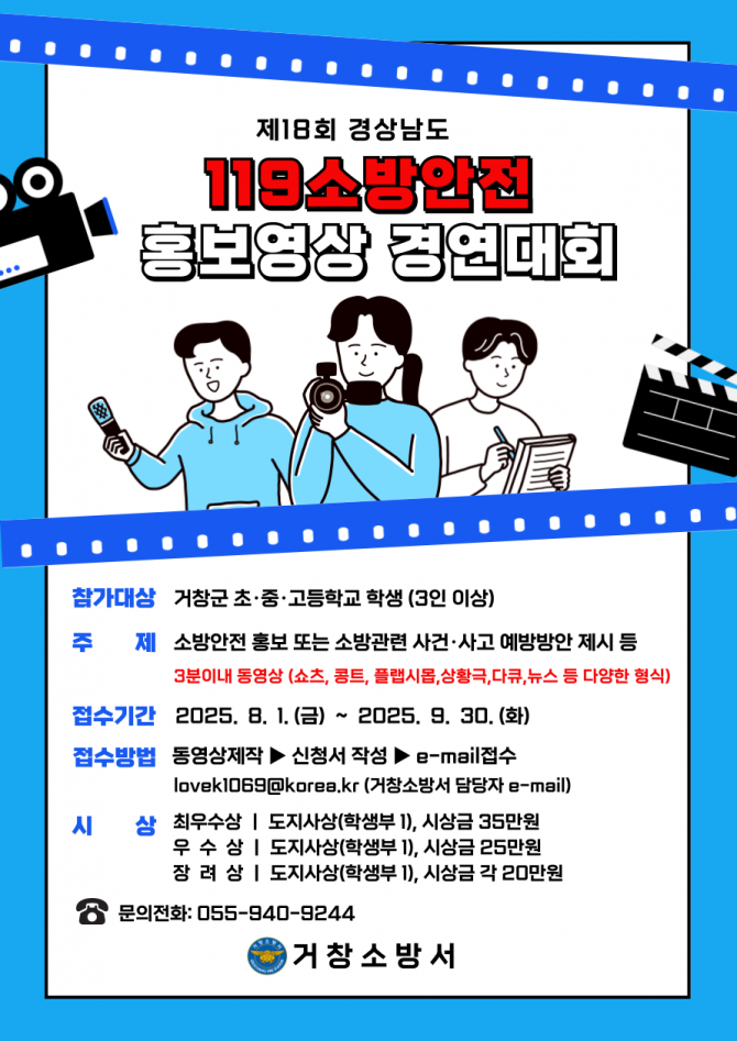 거창소방서(서장 강호봉)는 지역 내 초·중·고등학생을 대상으로 하는 제18회 경상남도 119소방안전 홍보영상 경연대회 참가자를 모집한다고 18일 밝혔다.