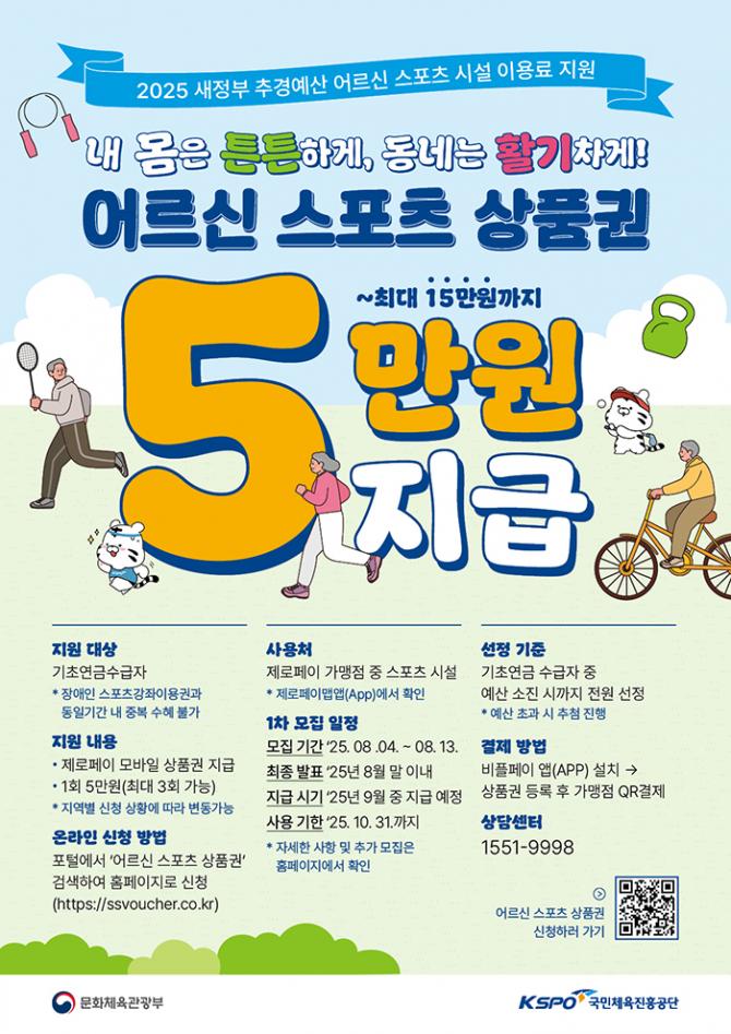 65세 이상 기초연금 수급금 받는 어르신은 8월 4일 9시부터 온라인 누리집(https://ssvoucher.co.kr)에서 신청할 수 있으며, 8월 말 추첨으로 대상자로 선정되면 스포츠 시설 이용 시 1회당 5만 원(1인 최대 3회, 15만 원)의 상품권을 지원받게 된다.