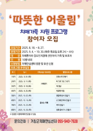 대상은 치매환자와 경도인지장애 진단자의 가족 또는 보호자로, 거창군 치매안심센터를 방문하거나 전화(☎940-7928)로 신청할 수 있으며, 모집 인원은 총 10명, 선착순 마감한다.