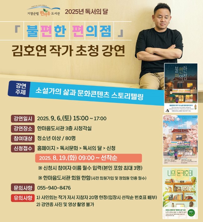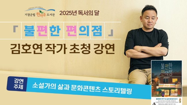 먼저, 9월 6일 오후 3시 ‘불편한 편의점’, ‘나의 돈키호테’의 저자 김호연 작가가 ‘소설가의 삶과 문화콘텐츠 스토리텔링’ 주제로 강연한다.