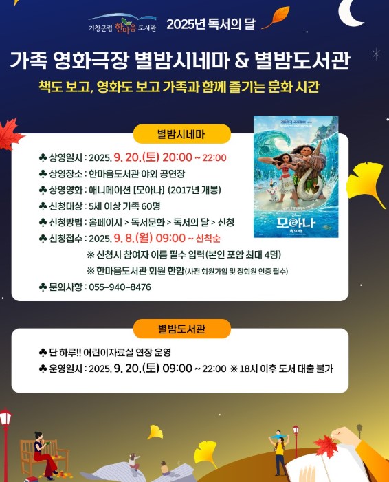 또한 9월 20일 도서관 야외공연장에서는 ‘별밤시네마’가 열리며, 당일 밤 10시까지 연장 운영하는 ‘별밤도서관’을 통해 가족이 함께 영화와 독서를 즐길 수 있는 특별한 시간을 선사한다.