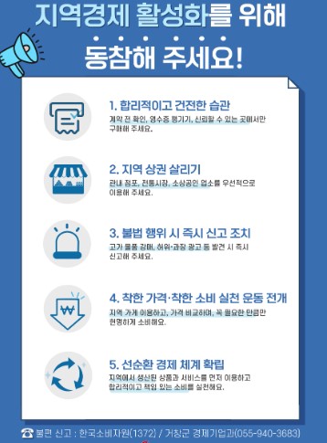 군 관계자는 “군민 모두가 합리적인 소비 문화를 실천하고 지역 상권을 적극적으로 이용할 때, 지역경제가 더욱 튼튼해진다”며, “특히 불법적 영업 행위가 의심되는 경우에는 한국소비자원(☎1372) 또는 거창군 경제기업과(☎940-3683)로 즉시 신고해 달라”고 강조했다.
