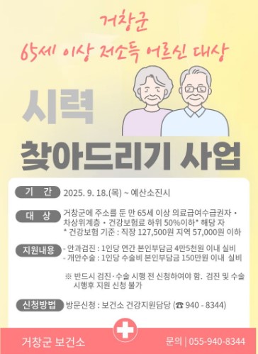 거창군은 9월 24일 고향사랑기부제 지정기부사업에 모인 기금으로 저소득 어르신들의 시력 회복을 돕는 ‘노인 시력 찾아드리기 사업’을 본격 추진한다고 밝혔다.