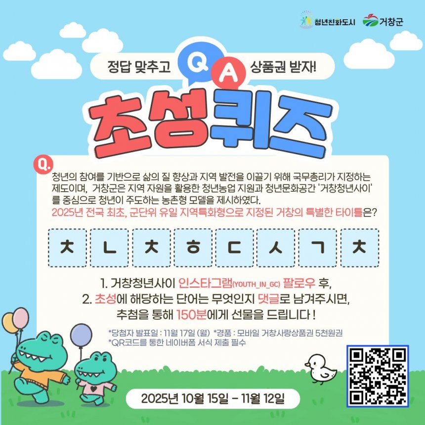 우선 거창군 청년정책 공식 인스타그램 계정(@Youth_in_gc)을 팔로우한 뒤, 이벤트 기간 중 게시되는 초성 퀴즈 게시물에 정답 댓글을 남기고, 게시물 내 안내된 네이버폼 링크를 통해 이름과 연락처 등 인적 사항을 제출하면 된다.
