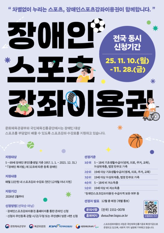 거창군은 취약계층의 스포츠 참여 기회 확대를 위해, 저소득층 유·청소년과 장애인에게 매월 체육시설 수강료를 지원하는 2026년 스포츠강좌이용권 신청을 11월 10일부터 28일까지 접수한다.