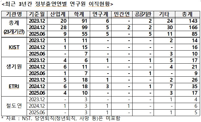 국회 과학기술정보방송통신위원회 신성범 의원(국민의힘. 경남 산청·함양·거창·합천)이 23일 국가과학기술연구회(NST)로부터 제출받은 자료에 따르면, 2023년 143명, 2024년 166명, 2025년 6월 현재 85명으로 최근 3년간 정부 출연연 연구원들의 이직이 매년 늘고 있는 추세로 확인됐다.