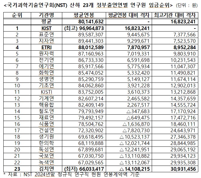 23개 연구원 평균 연봉은 8,014만원인 반면, 연봉 1위를 차지한 KIST 연구원의 평균 연봉은 9,696만원에 달하는 것으로 조사됐다.