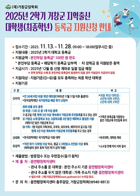 (재)거창군장학회는 오는 13일부터 28일까지 주소지 읍면 행정복지센터에서 ‘2025년 2학기 거창군 지역출신 대학생 등록금 지원사업’ 신청을 받는다.