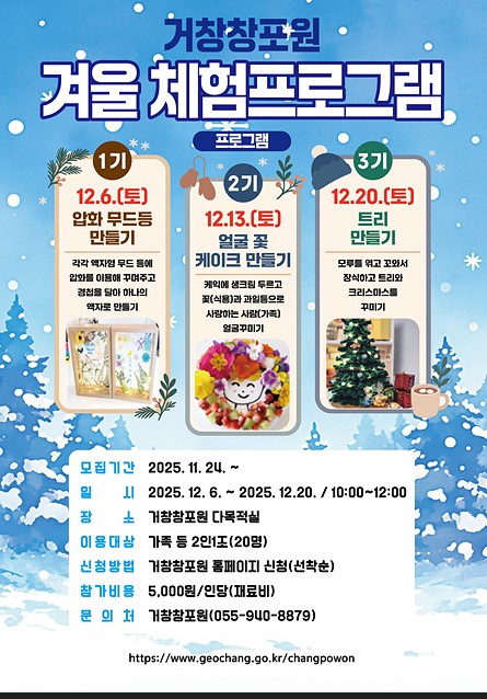 거창군 창포원은 사계절 체험프로그램과 정원 프로그램 활성화를 위해 다음 달 6일부터 방문자센터 다목적실과 열대식물원에서 다양한 겨울 체험 프로그램을 운영한다.