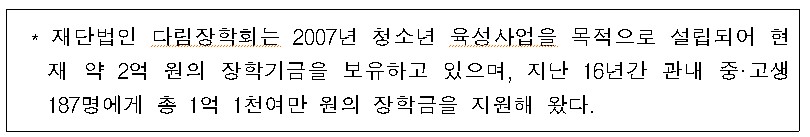 또, 재단법인 다림장학회*(이사장 최병철)에서는 자체 조성한 장학기금과 다림장학회의 이사 및 3개군 농협에서 기탁한 장학금 총 1,200만 원을 관내 모범 청소년 12명의 학생들에게 장학금을 전달하고 격려했다.