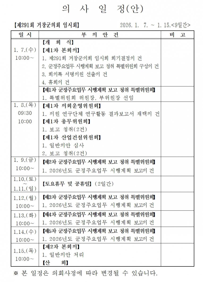 거창군의회(의장 이재운)는 1월 7일부터 15일까지 9일간의 일정으로 제291회 임시회를 개회하고, 2026년을 여는 본격적인 의정활동에 돌입했다.